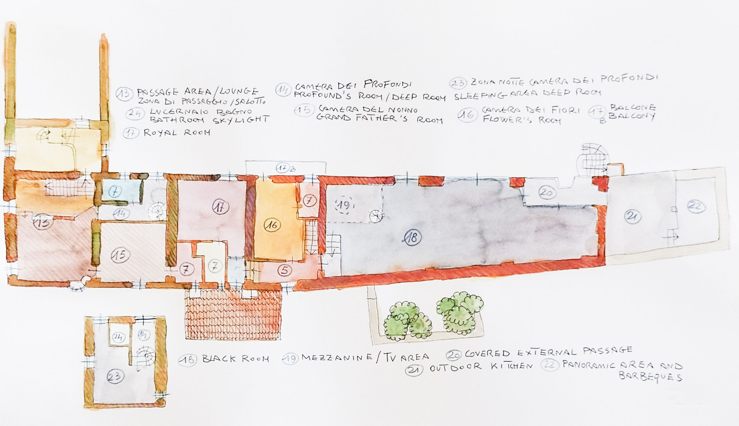 L’idea di base dello sviluppo della piscina è stata descritta da Elle Decor con le seguenti parole: “l’idea era riportare in casa i colori di un lago di montagna, sfruttando gli spazi di un edificio rurale: per la piscina coperta ma in stretto contatto con la natura, l’architetto Marco Poncellini ha usato sul fondo pietra naturale che crea giochi di luce suggestivi” (Elle Decor outdoor – La nuova stanza all’aperto)